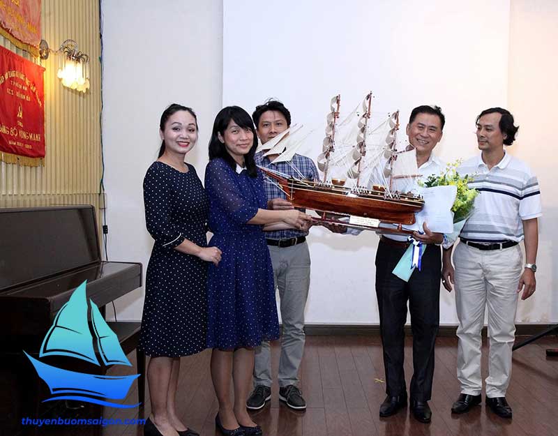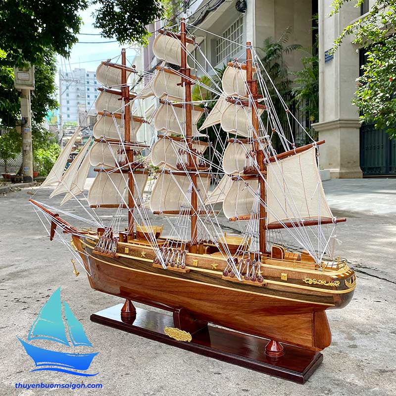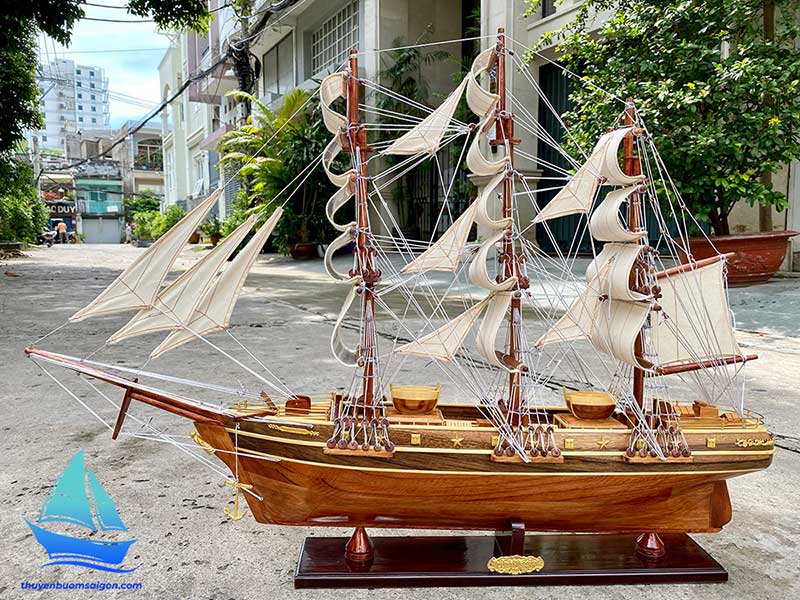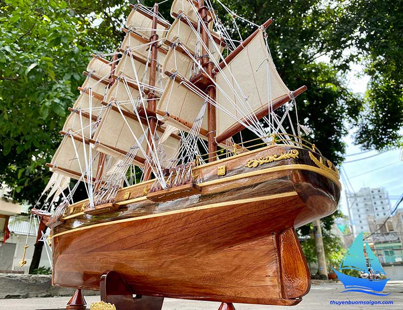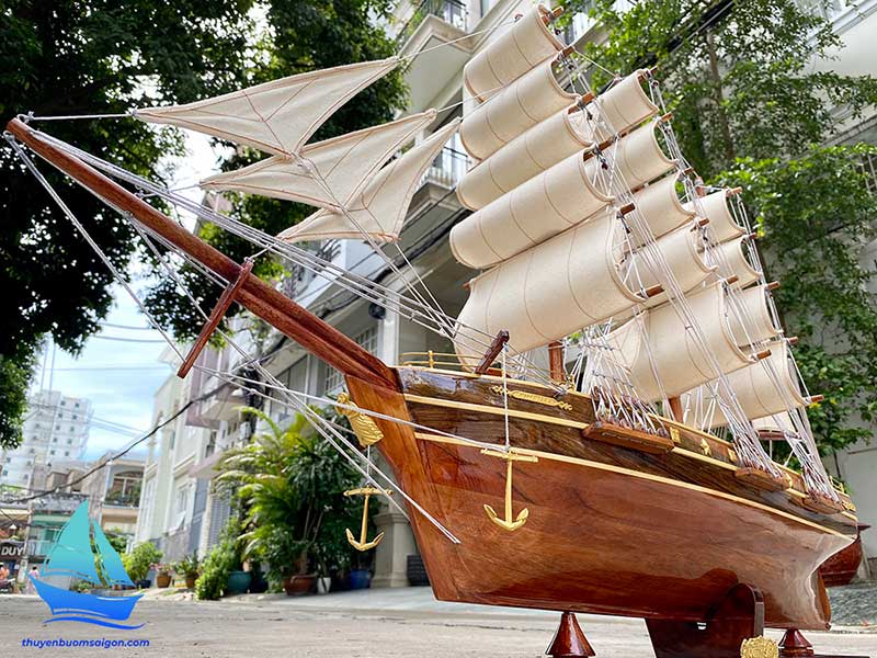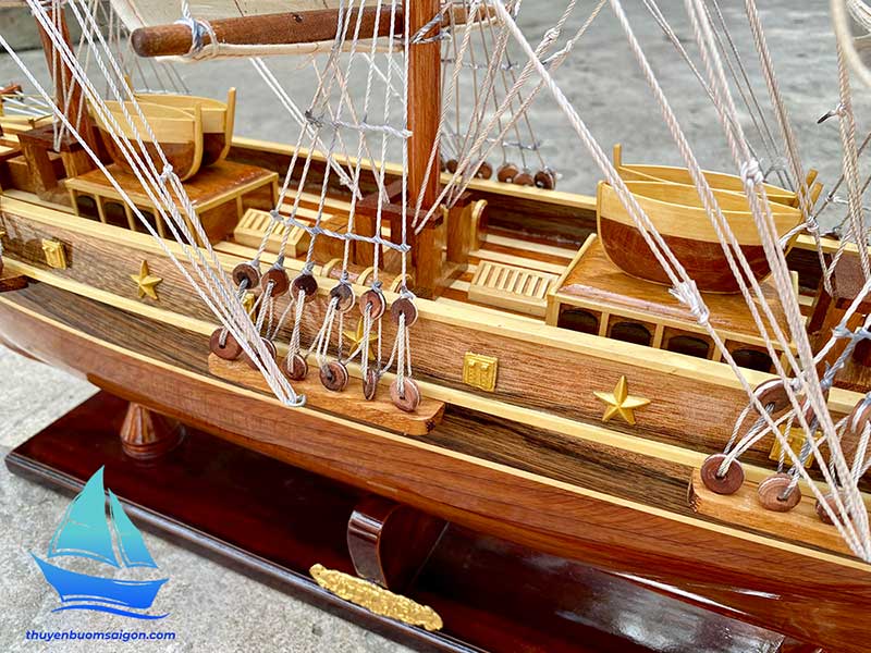 Sản phẩm được chế tác thủ công hoàn toàn từ gỗ tự nhiên, kết hợp buồm vải canvas, dây dù và các chi tiết kim loại tinh xảo. Tổng thể mô hình có tỷ lệ cân đối, bố cục buồm no gió, thân tàu chắc chắn, tạo cảm giác mạnh mẽ và sang trọng khi trưng bày.