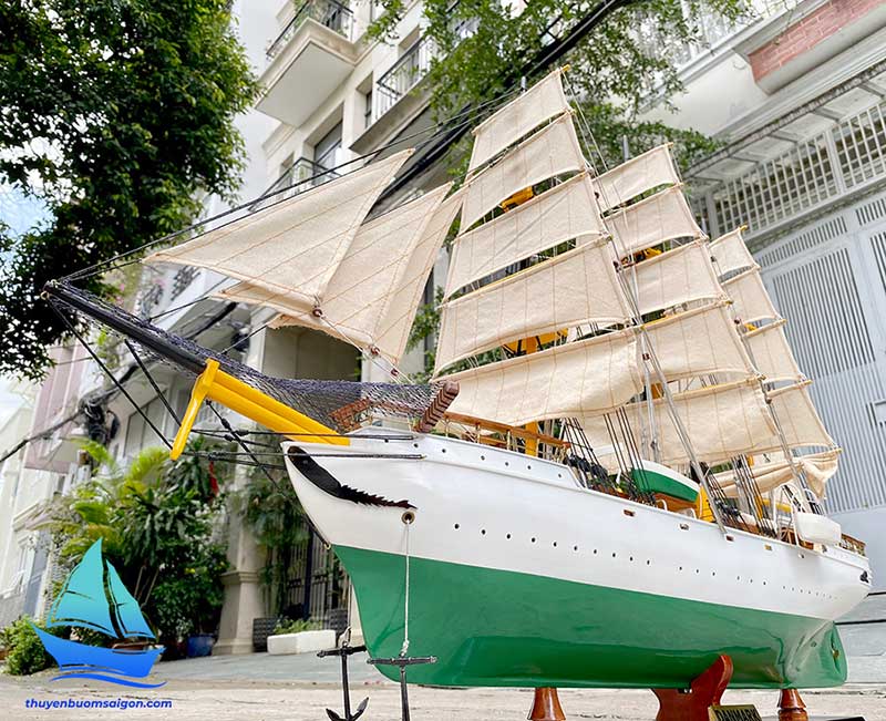 Chất liệu: Gỗ tự nhiên, buồm vải, dây dù, chi tiết kim loại và bảng tên đồng thau