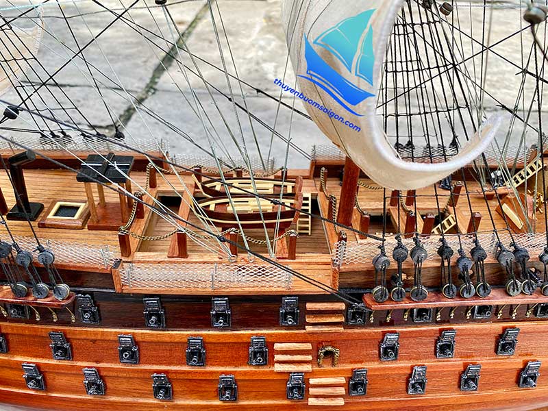 Mặt boong được lát bằng gỗ xẻ mảnh, mô phỏng chính xác kết cấu tàu thật. Các chi tiết như vô lăng, lan can, cầu thang, nắp hầm, xuồng cứu sinh, tời kéo, dây neo… đều được tái hiện đầy đủ, sắc nét và sống động. Hệ thống buồm vải căng gió kết hợp dây buồm đan tay mang lại cảm giác mạnh mẽ, uy nghiêm và đậm chất hàng hải cổ điển.